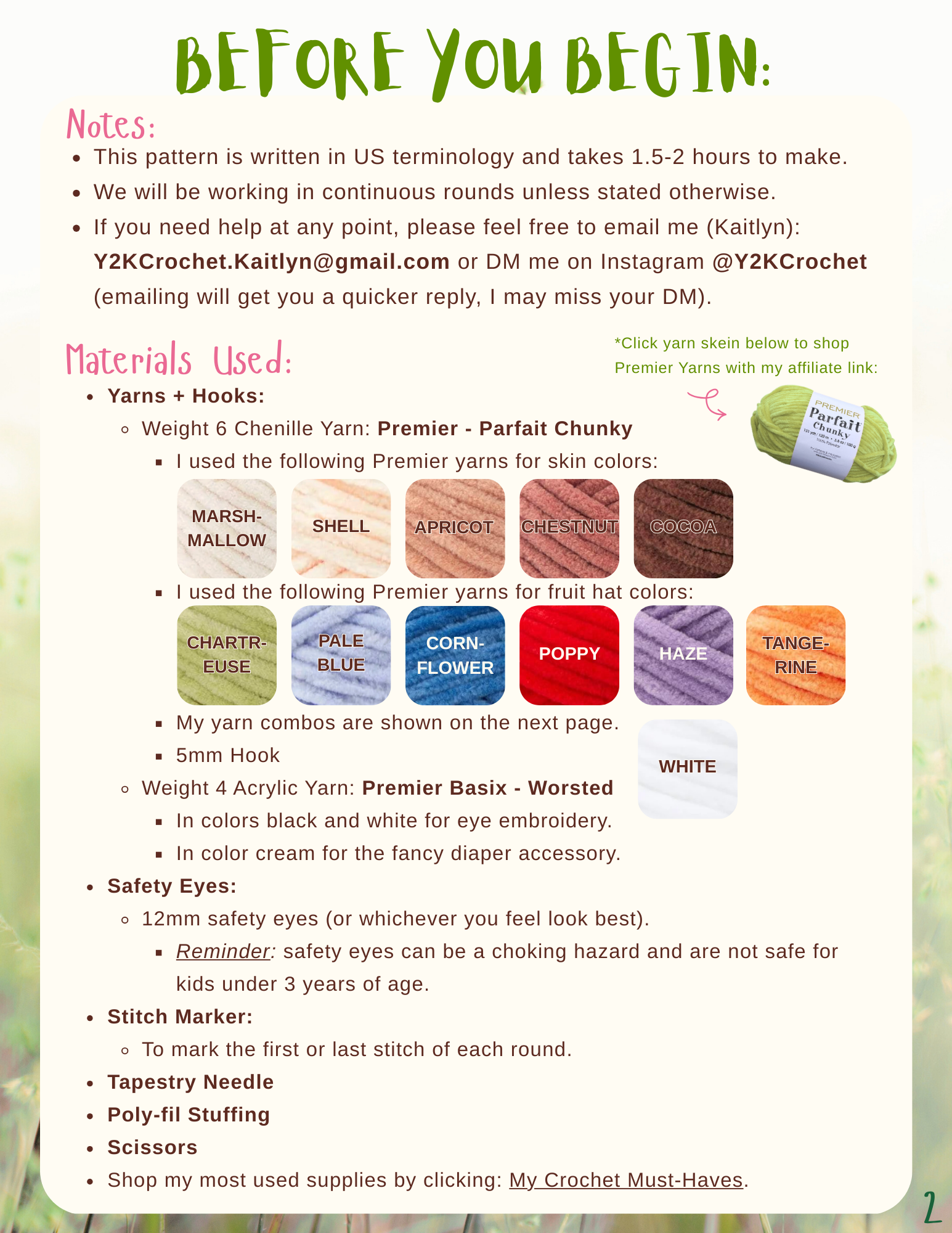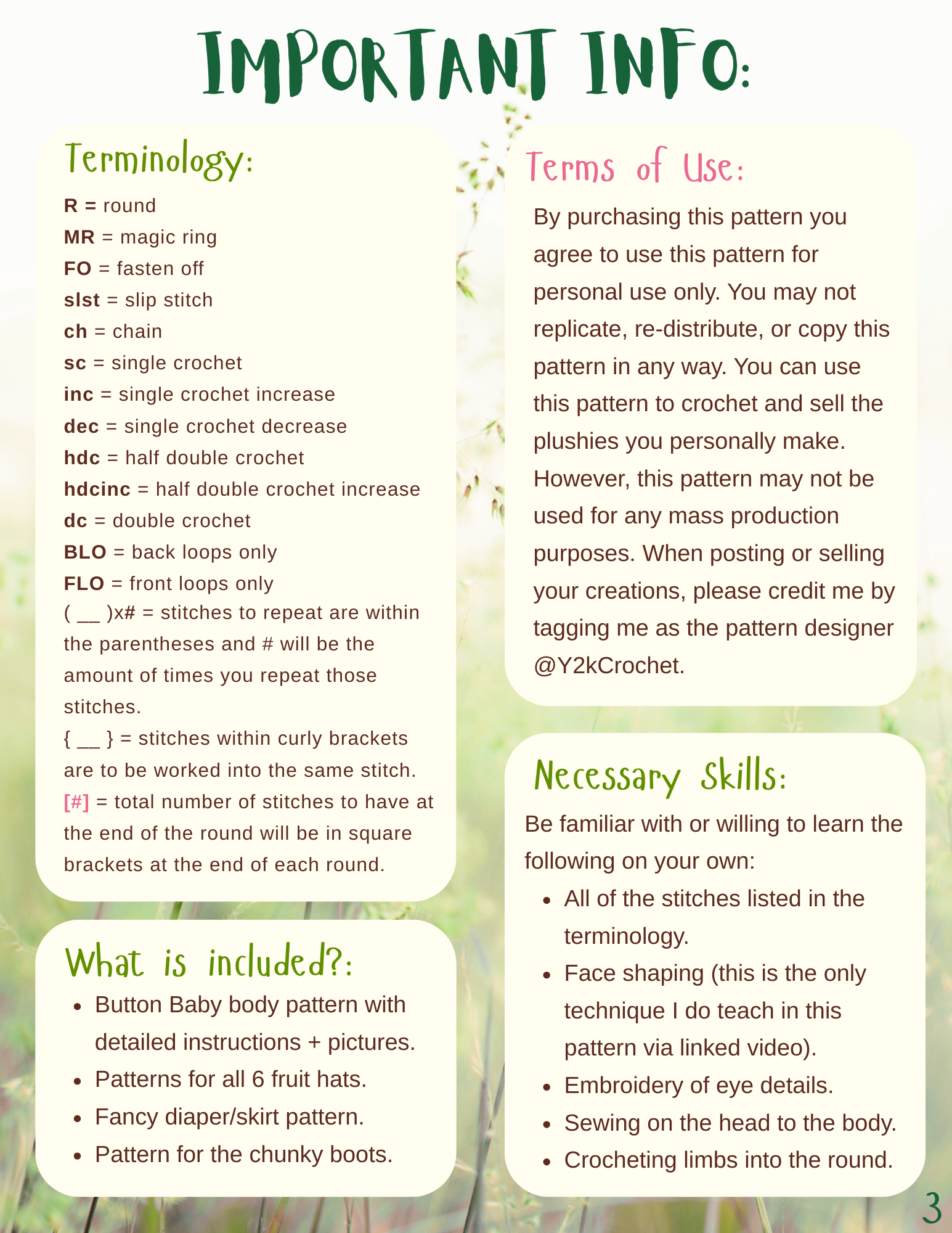 By purchasing this pattern you agreed to using this pattern for personal use only. You may not replicate, re-distribute, edit, or copy this pattern in any way. You can use this pattern to crochet and sell the plushies you personally make. However, this pattern may not be used for any mass production purposes. When posting or selling your creations, please credit me by tagging me as the pattern designer @Y2kCrochet.